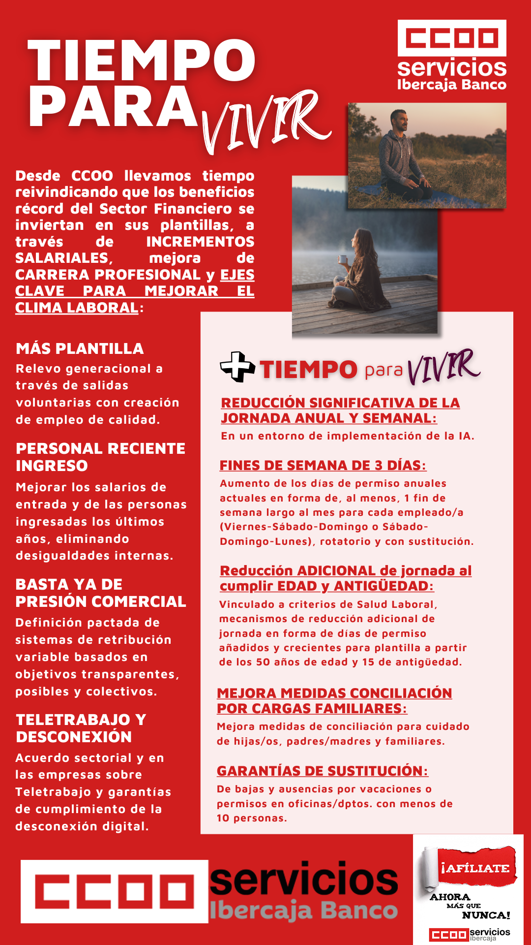 Estimada compañera, estimado compañero: Desde CCOO llevamos tiempo exigiendo que los beneficios récord de las empresas del Sector Financiero se inviertan en sus plantillas, a través de INCREMENTOS SALARIALES, mejoras en la CARRERA PROFESIONAL y EJES CLAVE PARA MEJORAR EL CLIMA LABORAL: – Relevo generacional a través de salidas voluntarias con creación de empleo de calidad.– Mejora de los salarios de entrada y de las…