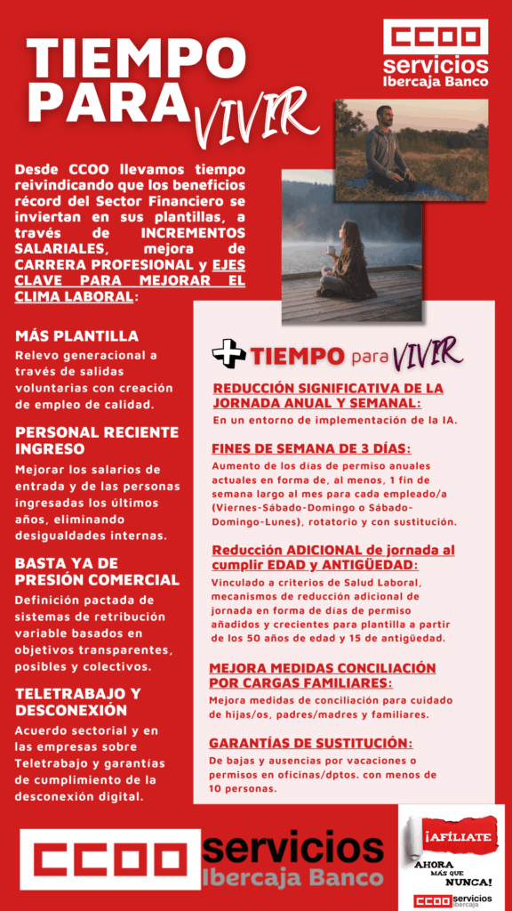 Mediante el díptico adjunto lanzamos una campaña que va a marcar nuestras reivindicaciones durante 2026 en cada empresa y en la negociación de los convenios del sector financiero a partir de 2027. Una campaña en la que exigimos + TIEMPO PARA VIVIR, en la que proponemos y reivindicamos, como puedes ver en el díptico adjunto, un aumento de los días de permiso anuales en forma de fines de semana de 3 días, reducciones adicionales de jornada al cumplir 50 años de edad y 15 de antigüedad, mejora de medidas de conciliación por cargas familiares y garantías de sustitución por vacaciones o permisos en oficinas/departamentos con menos de 10 personas.